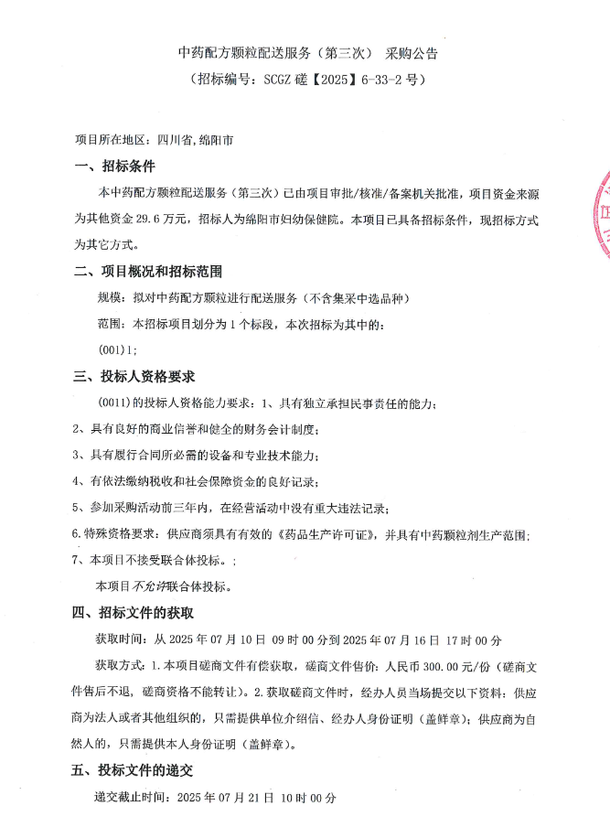 【绵阳市妇幼保健院】四川省绵阳市妇幼保健院中药配方颗粒配送服务(第三次)采购公告