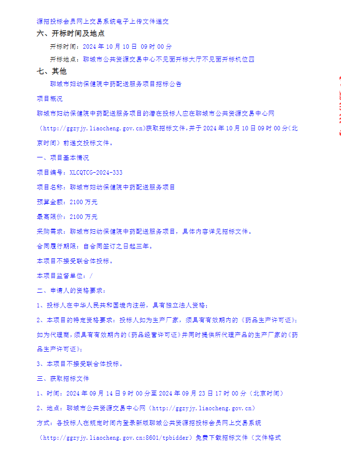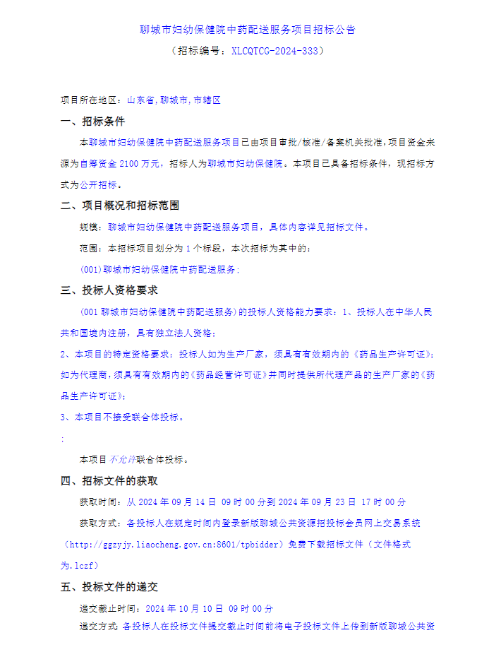 【聊城市妇幼保健院】山东省聊城市妇幼保健院中药配送服务项目招标公告