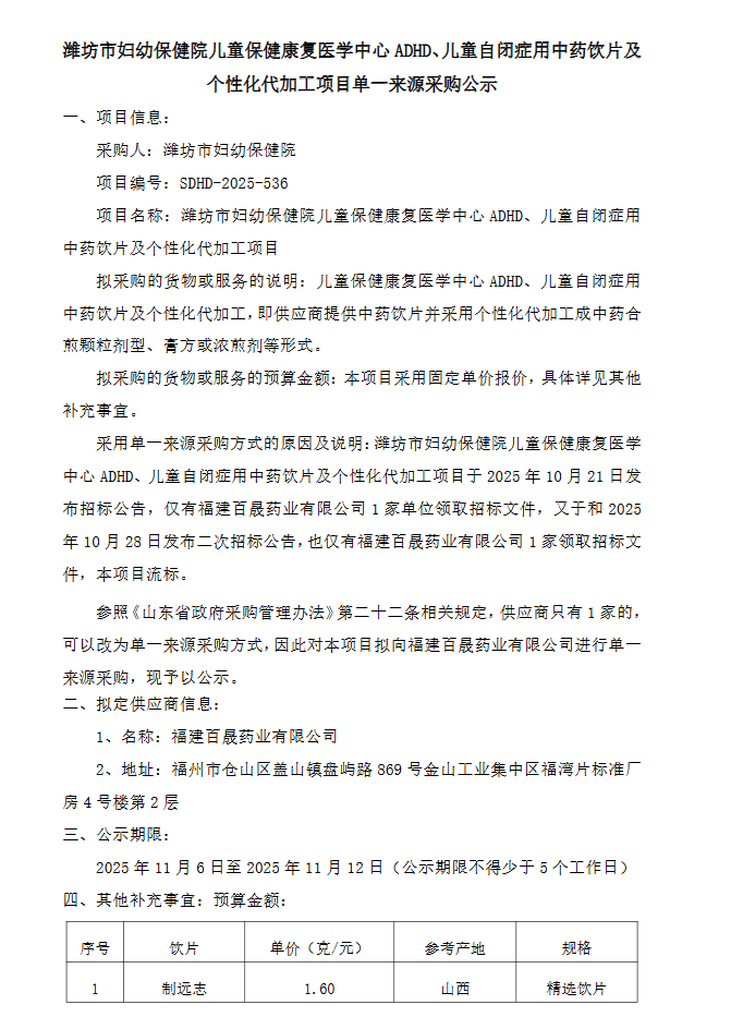 【潍坊市妇幼保健院】山东省潍坊市妇幼保健院儿童保健康复医学中心ADHD、儿童自闭症用中药饮片及个性化代加工项目单一来源采购公示