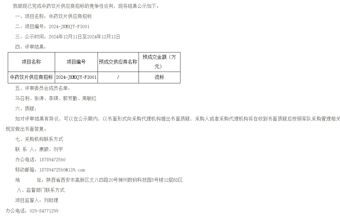 【军队采购】军队采购网中药饮片供应商招标废标公示(2024-JKMXJY-F3001)(第1包)
