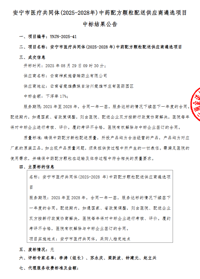 【昆明市安宁市医疗共同体】云南省安宁市医疗共同体(2025-2028年)中药配方颗粒配送供应商遴选项目中标结果公告