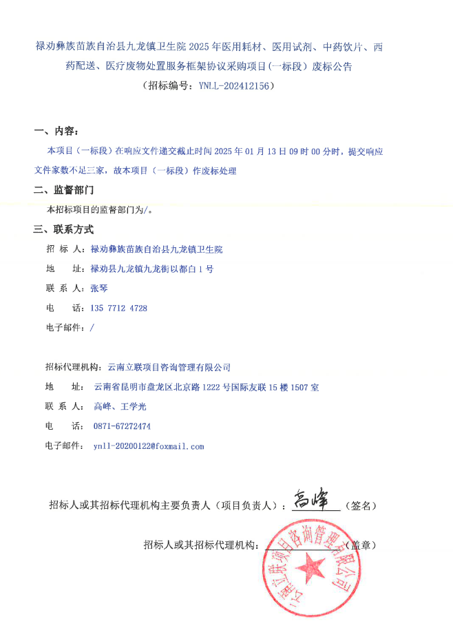 【昆明市禄劝彝族苗族自治县九龙镇卫生院】云南省昆明市禄劝彝族苗族自治县九龙镇卫生院2025年医用耗材、医用试剂、中药饮片、西药配送、医疗废物处置服务框架协议采购项目(一标段)废标公告