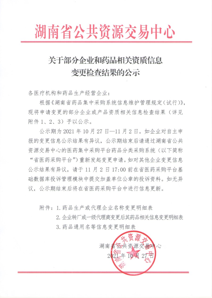 【湖南】2021年湖南省关于部分企业和药品相关资质信息变更检查结果的公示