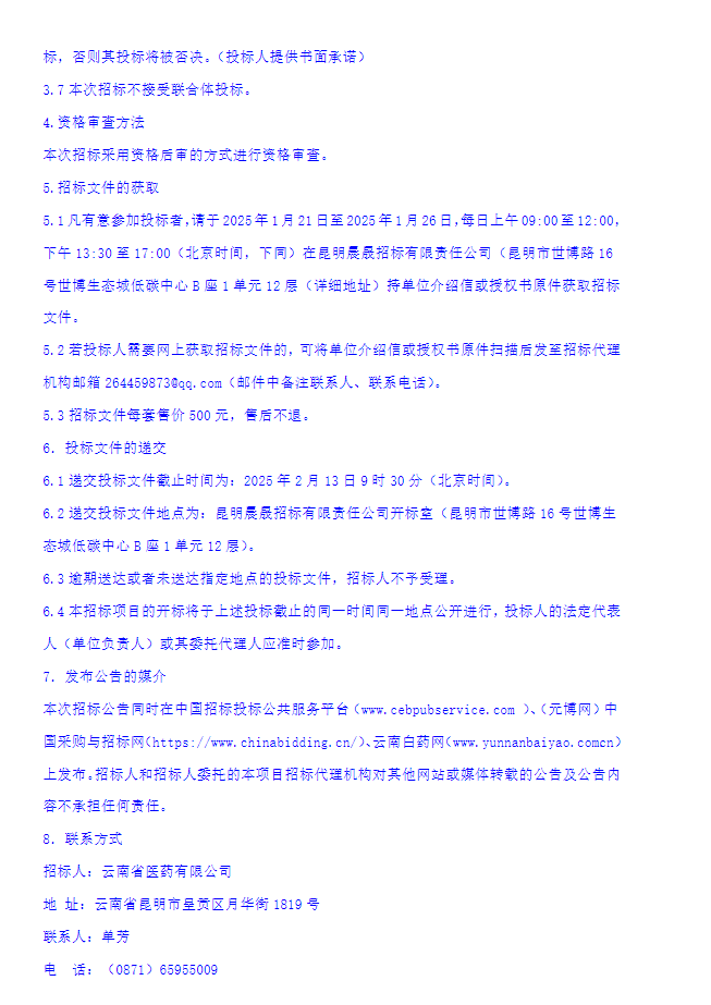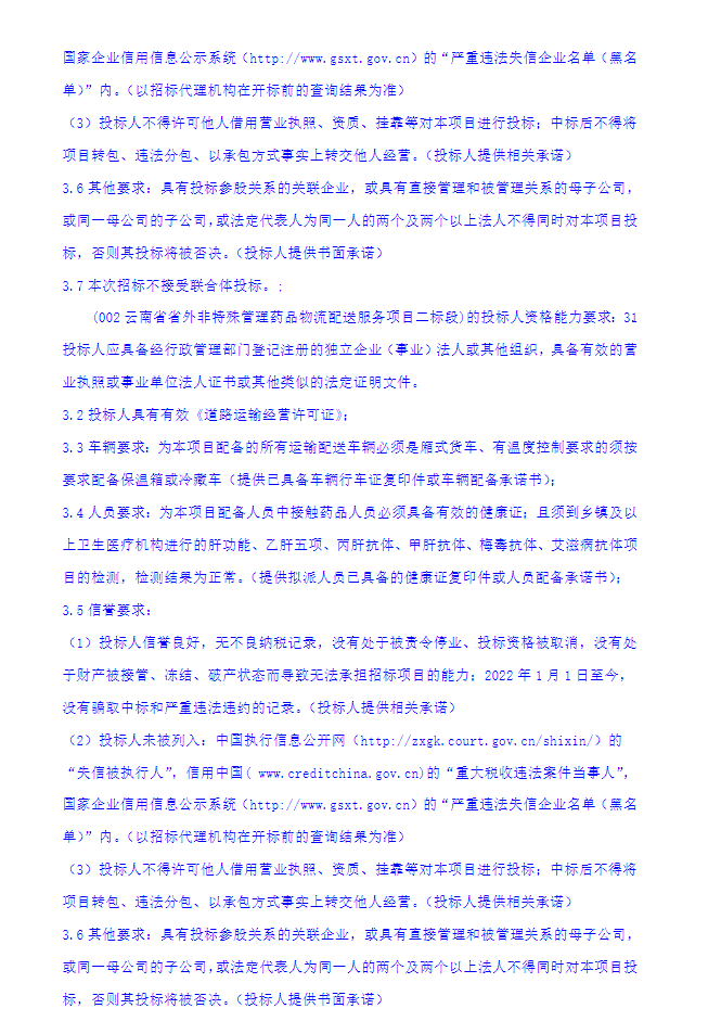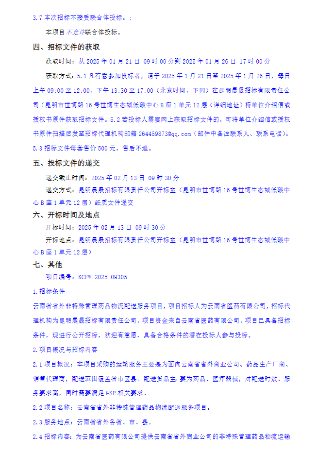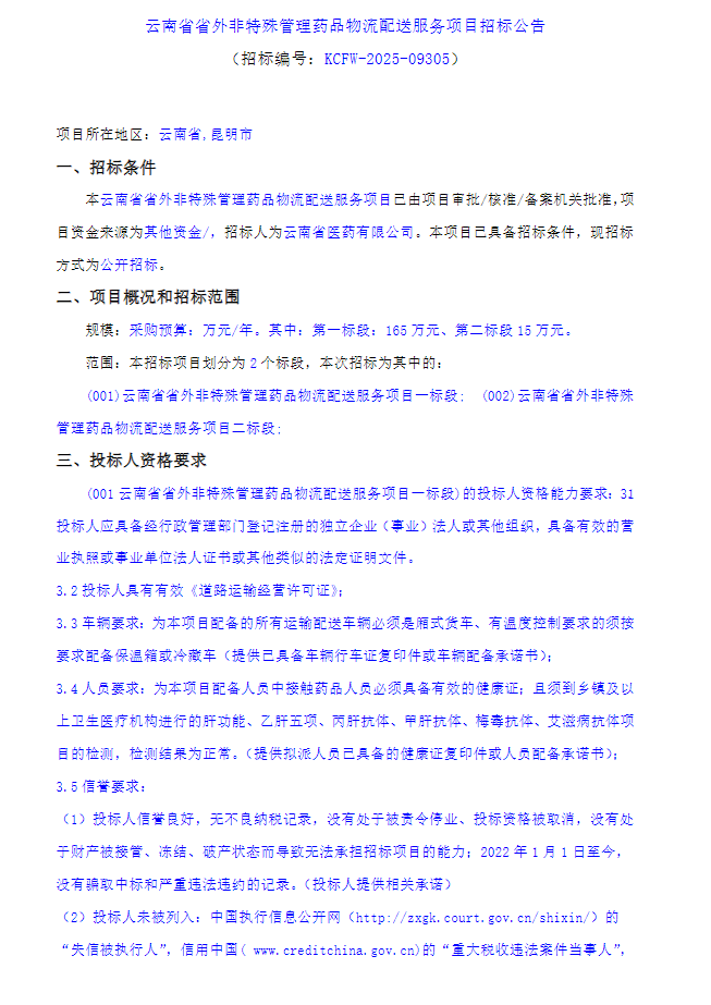 【云南省医药有限公司】云南省省外非特殊管理药品物流配送服务项目招标公告