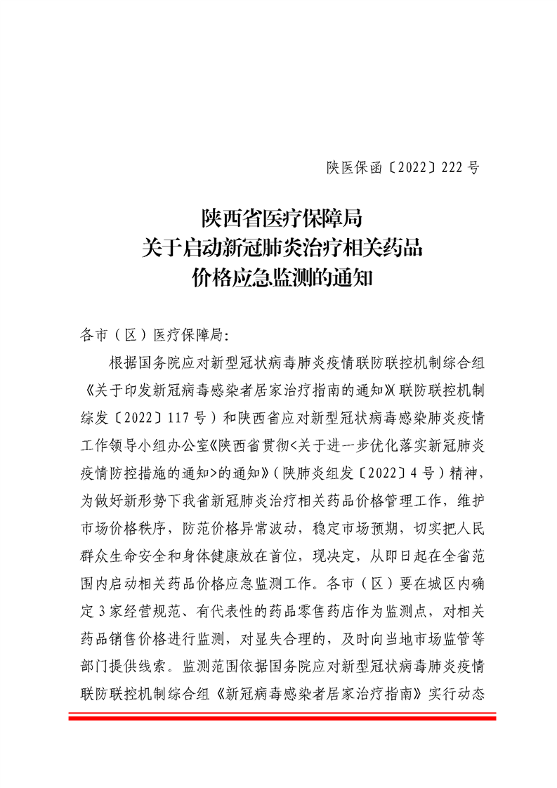 根据国务院应对新型冠状病毒肺炎疫情联防联控机制综合组《关于印发新冠病毒感染者居家治疗指南的通知》联防联控机制综发〔2022〕117号)和陕西省应对新型冠状病毒感染肺炎疫情工作领导小组办公室《陕西省贯彻<关于进一步优化落实新冠肺炎疫情防控措施的通知>的通知》(陕肺炎组发〔2022〕4号)精神,为做好新形势下我省新冠肺炎治疗相关药品价格管理工作,维护市场价格秩序,防范价格异常波动,稳定市场预期,切实把人民群众生命安全和身体健康放在首位,现决定,从即日起在全省范围内启动相关药品价格应急监测工作。各市(区)要在城区内确定3家经营规范、有代表性的药品零售药店作为监测点,对相关药品销售价格进行监测,对显失合理的,及时向当地市场监管等部门提供线索。监测范围依据国务院应对新型冠状病毒肺炎疫情联防联控机制综合组《新冠病毒感染者居家治疗指南》实行动态调整。