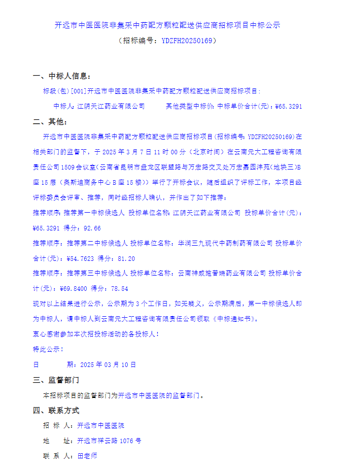 【红河哈尼族彝族自治州开远市中医医院】云南省红河哈尼族彝族自治州开远市中医医院非集采中药配方颗粒配送供应商招标项目中标公示