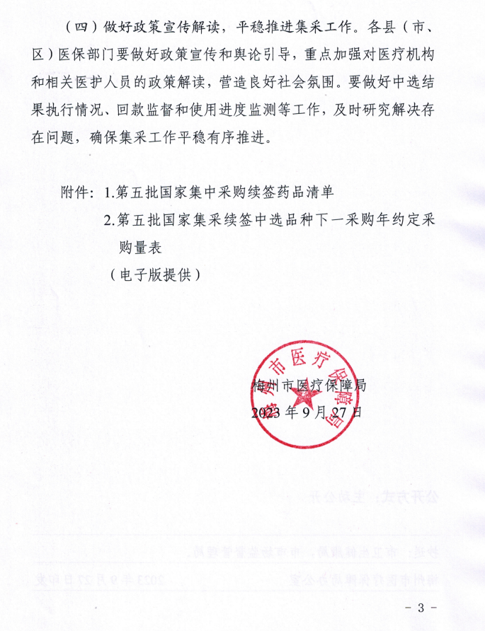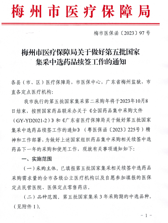 【梅州】梅州市医疗保障局关于做好第五批国家集采中选药品续签工作的通知