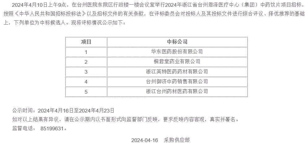 【台州恩泽医疗中心】浙江省台州恩泽医疗中心(集团)中药饮片项目预中标公示