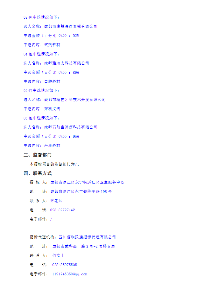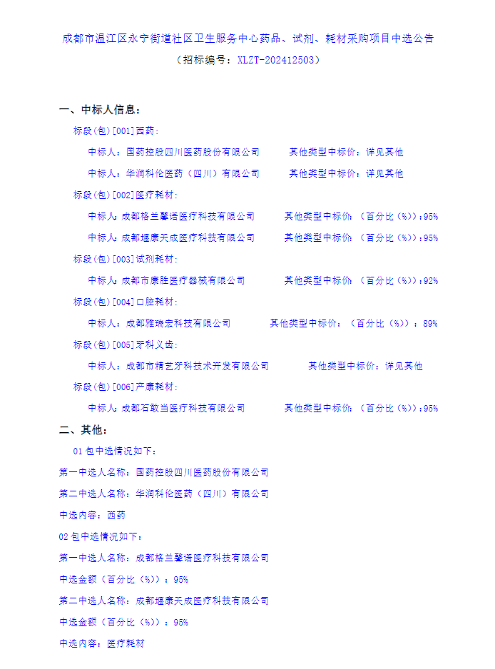 【成都市温江区永宁街道社区卫生服务中心】四川省成都市温江区永宁街道社区卫生服务中心药品、试剂、耗材采购项目中选公告
