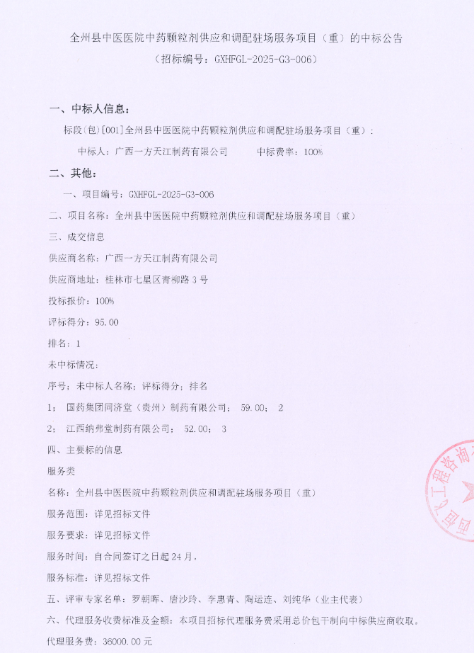 【桂林市全州县中医医院】广西壮族自治区桂林市全州县中医医院中药颗粒剂供应和调配驻场服务项目(重)的中标公告
