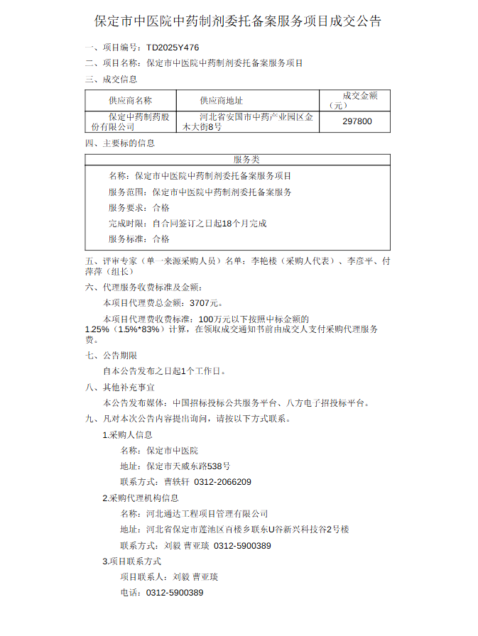 【保定市中医院】河北省保定市中医院中药制剂委托备案服务项目成交公告
