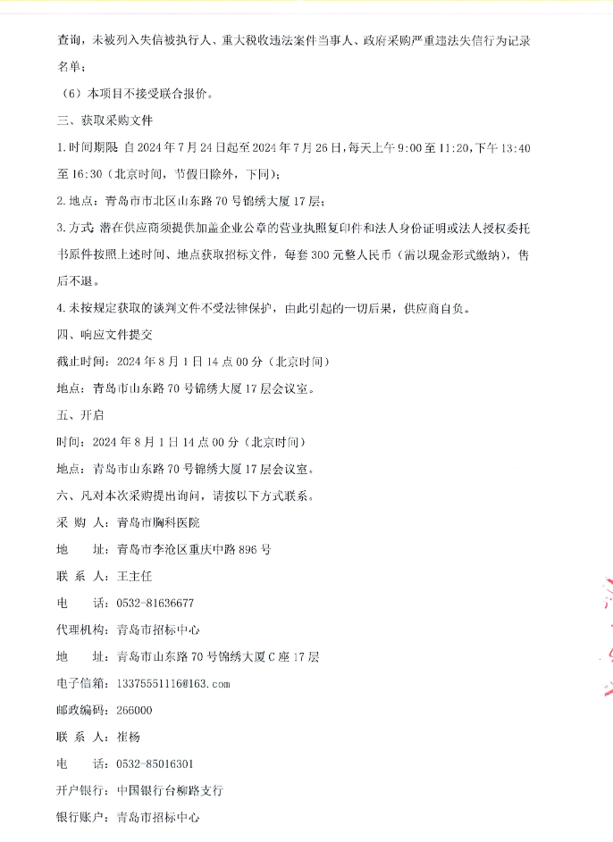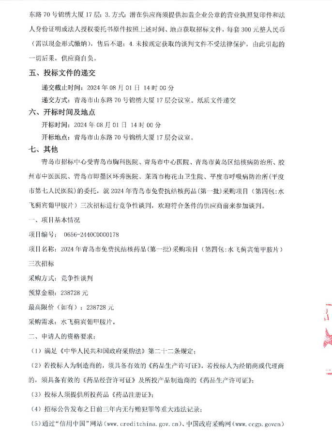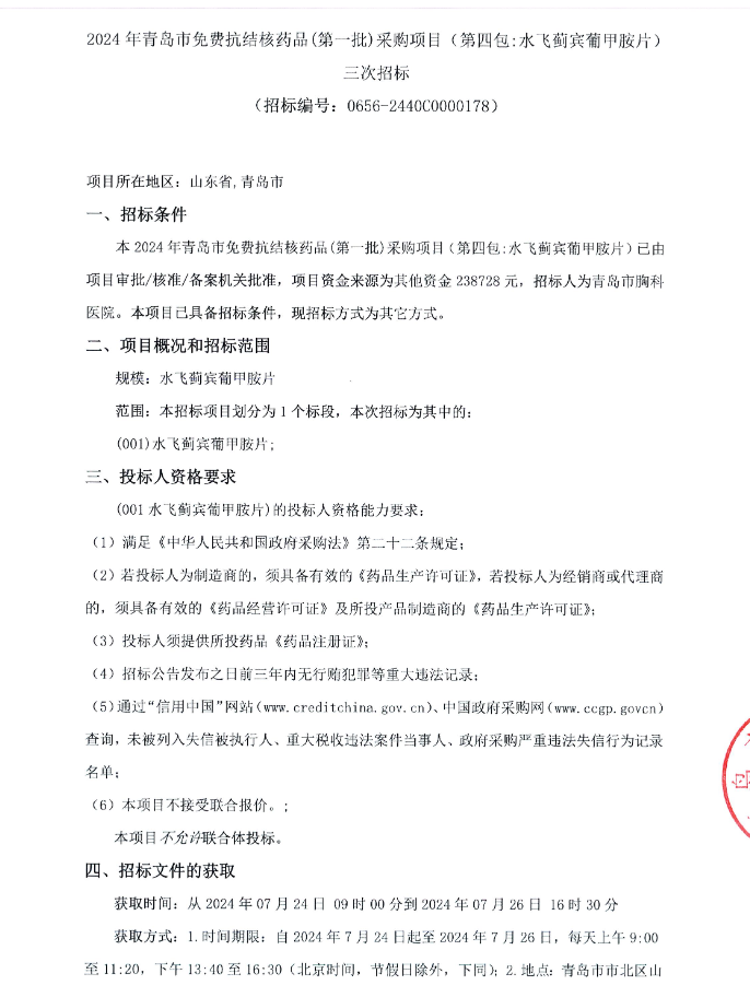 【青岛市胸科医院】山东省2024年青岛市免费抗结核药品(第一批)采购项目(第四包:水飞蓟宾葡甲胺片)三次招标