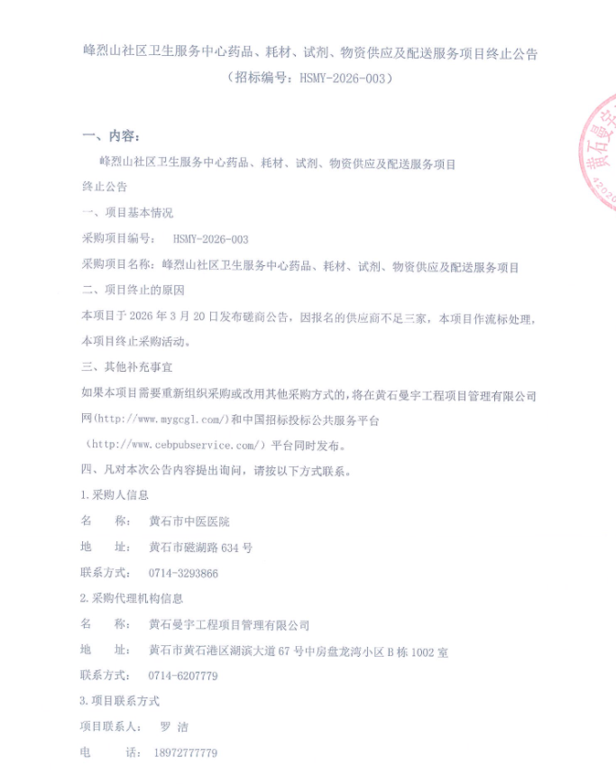 【黄石市中医医院】湖北省黄石市峰烈山社区卫生服务中心药品、耗材、试剂、物资供应及配送服务项目终止公告