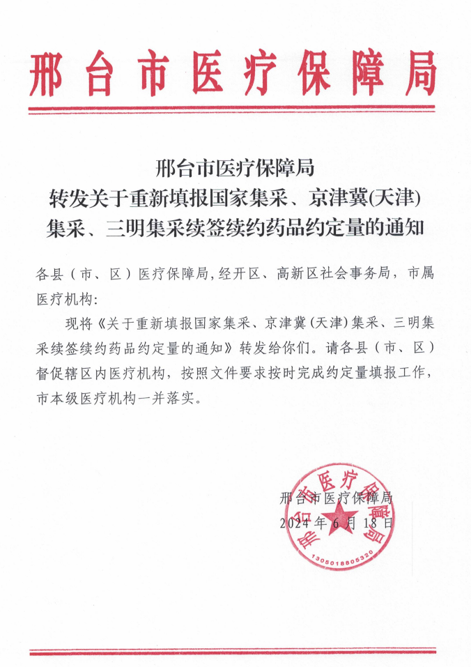 【邢台】邢台市医疗保障局转发关于重新填报国家集采、京津冀(天津)集采、三明集采续签续约药品约定量的通知