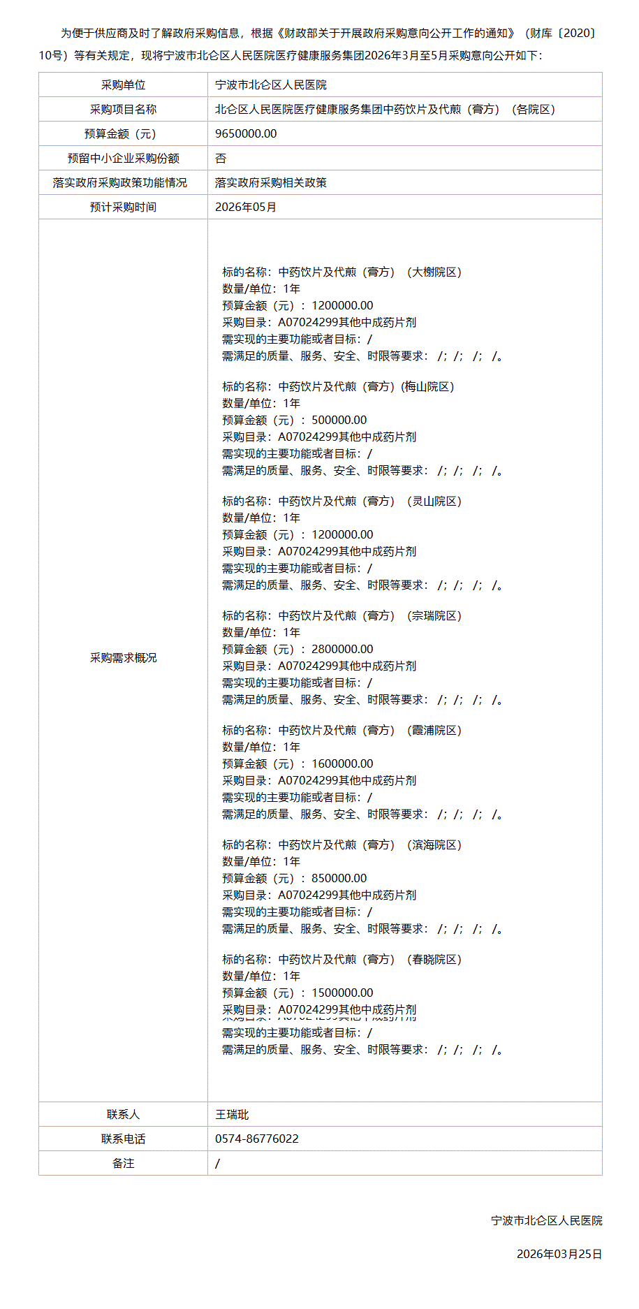 【宁波市北仑区人民医院】浙江省宁波市北仑区人民医院医疗健康服务集团2026年3月至5月政府采购意向1