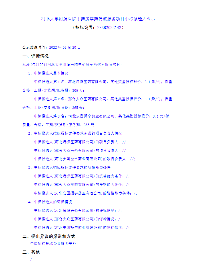 【河北大学附属医院】河北大学附属医院中药房草药代煎服务中标候选人公示