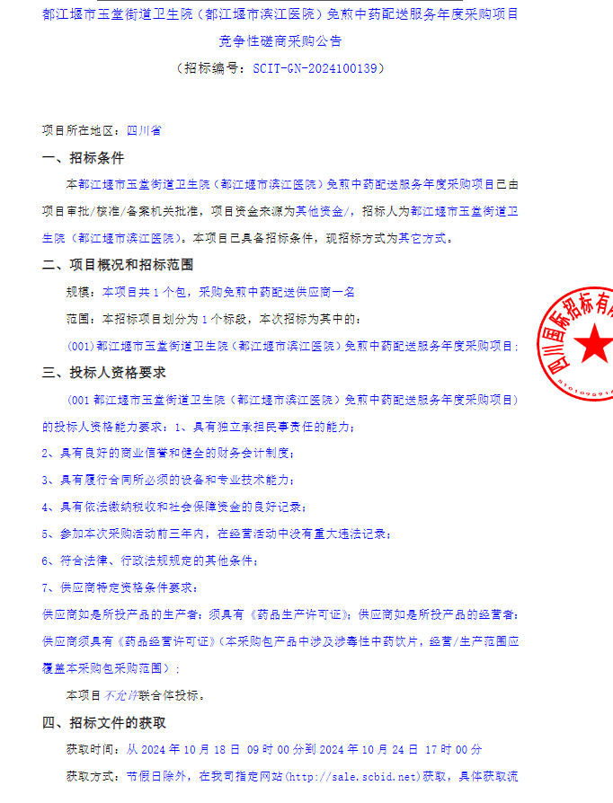 【成都市都江堰市玉堂街道卫生院】四川省成都市都江堰市玉堂街道卫生院(都江堰市滨江医院)免煎中药配送服务年度采购项目竞争性磋商采购公告