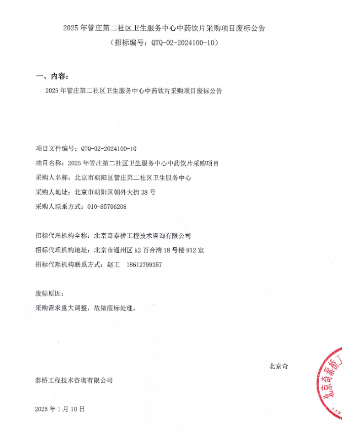 【北京市朝阳区管庄第二社区卫生服务中心】北京市2025年管庄第二社区卫生服务中心中药饮片采购项目废标公告