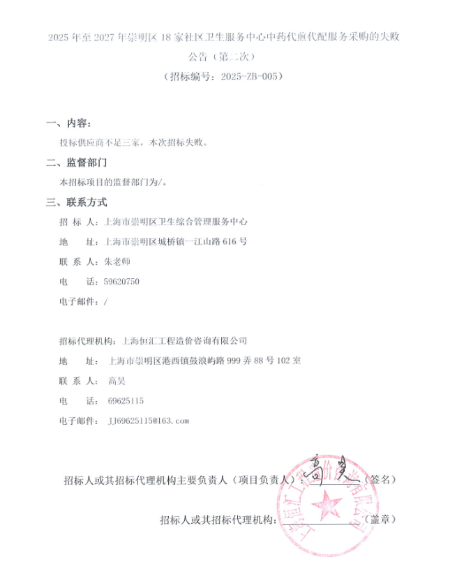 【上海市崇明区卫生综合管理服务中心】上海市2025年至2027年崇明区18家社区卫生服务中心中药代煎代配服务采购的失败公告(第二次)
