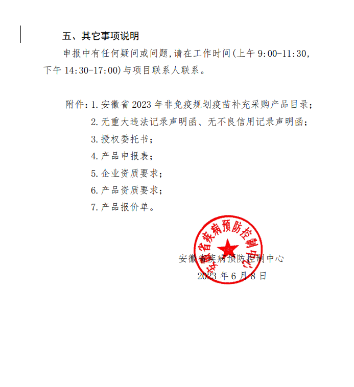 根据《中华人民共和国疫苗管理法》(以下简称《疫苗管理法》)及《关于印发安徽省非免疫规划疫苗集中采购方案的通知》(皖卫疾控发〔2021〕2号)相关要求,我省决定开展2023年非免疫规划疫苗补充采购工作。现对有关事项公告如下: