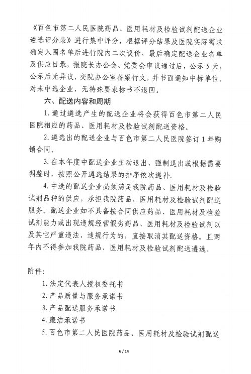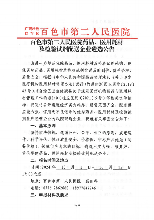 【百色市第二人民医院】广西壮族自治区百色市第二人民医院药品、医用耗材及检验试剂配送企业遴选公告