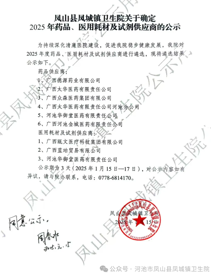 【河池市凤山县凤城镇卫生院】广西壮族自治区河池市凤山县凤城镇卫生院关于2025年药品、医用耗材及试剂供应商遴选结果的公示