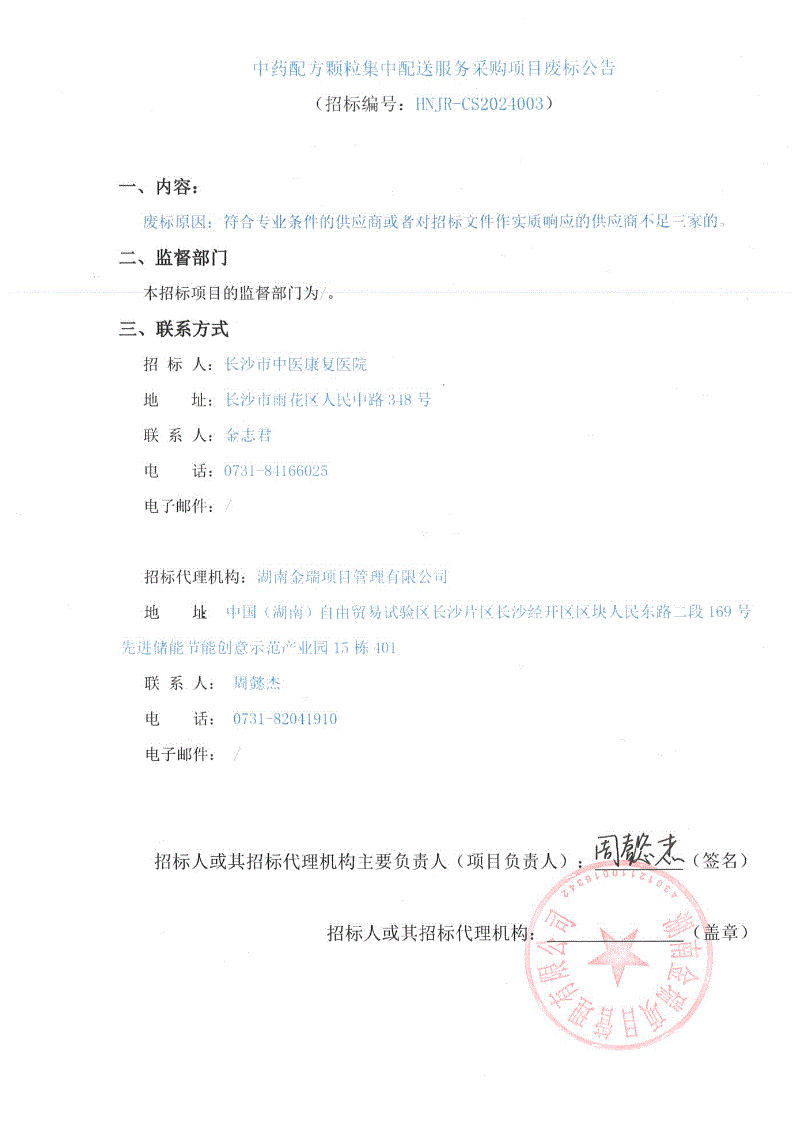 【长沙市中医康复医院】湖南省长沙市中医康复医院中药配方颗粒集中配送服务采购项目废标公告