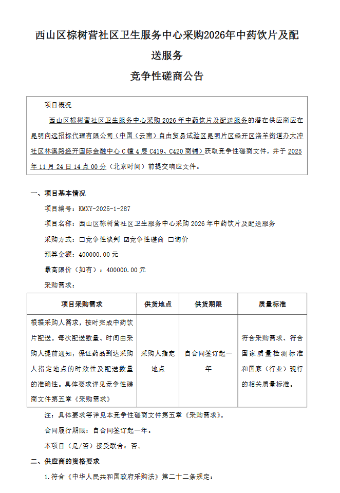 【昆明市西山区棕树营社区卫生服务中心】云南省昆明市西山区棕树营社区卫生服务中心采购2026年中药饮片及配送服务竞争性磋商公告