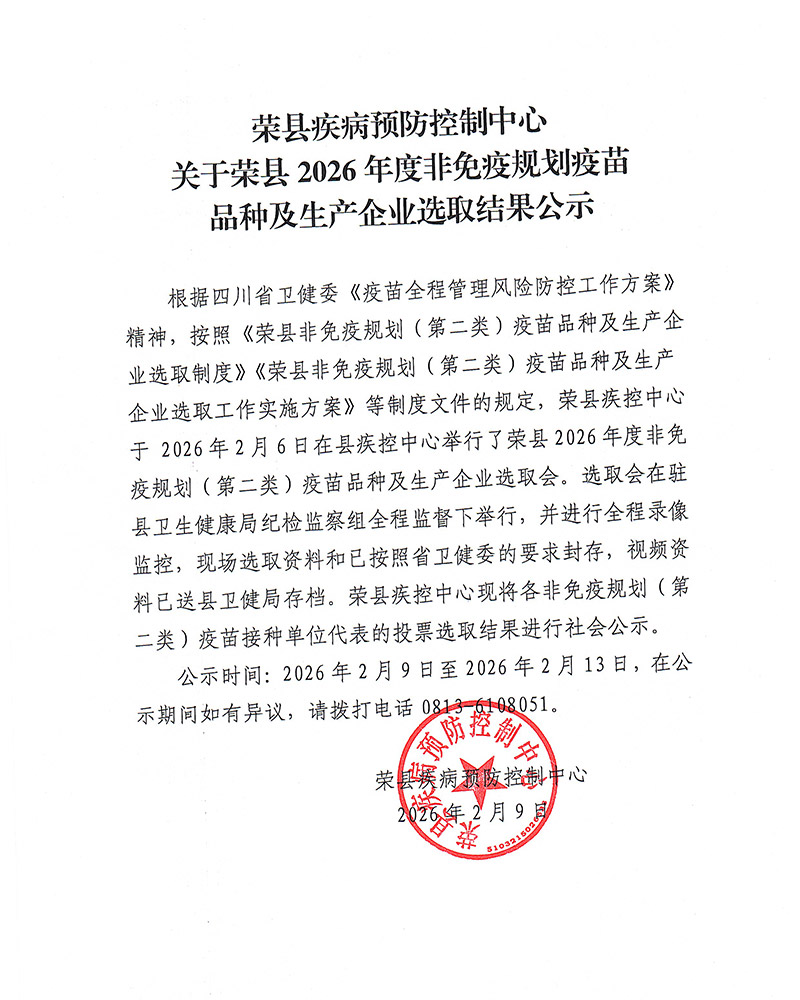 【自贡】荣县疾病预防控制中心关于荣县2026年度非免疫规划疫苗品种及生产企业选取结果公示