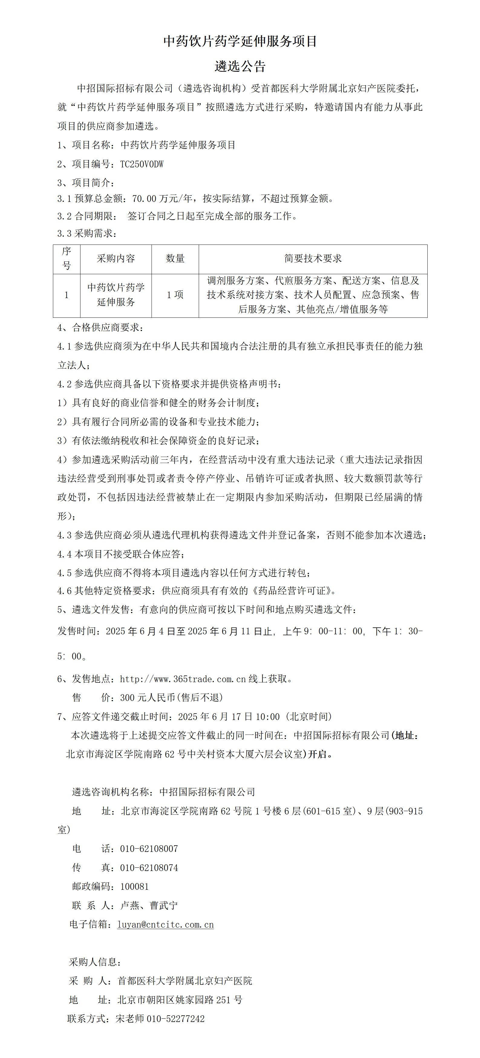 【首都医科大学附属北京妇产医院】北京市首都医科大学附属北京妇产医院中药饮片药学延伸服务项目遴选公告
