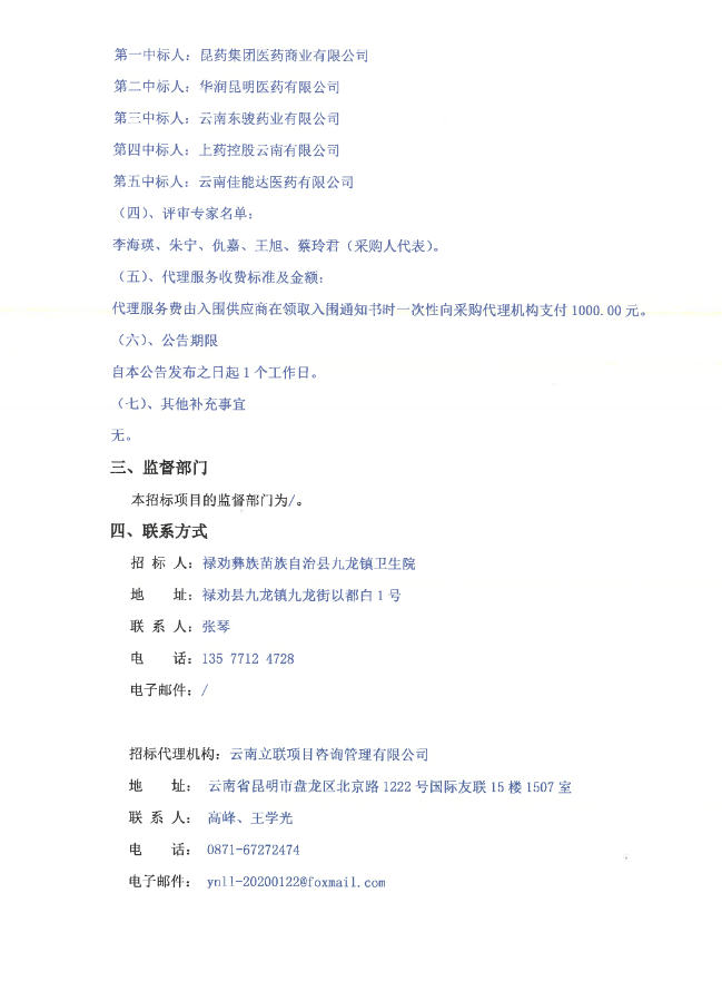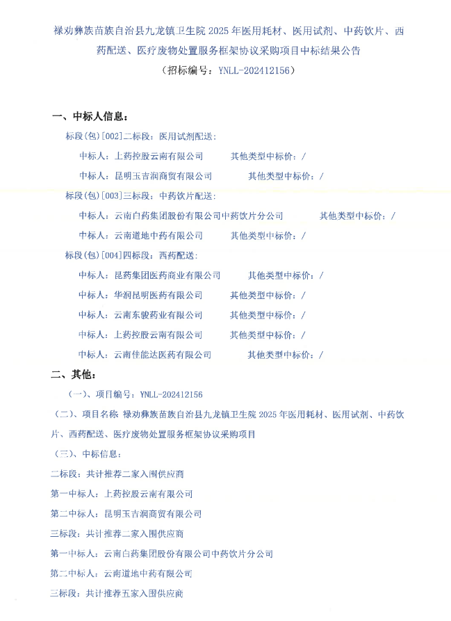 【昆明市禄劝彝族苗族自治县九龙镇卫生院】云南省昆明市禄劝彝族苗族自治县九龙镇卫生院2025年医用耗材、医用试剂、中药饮片、西药配送、医疗废物处置服务框架协议采购项目中标结果公告
