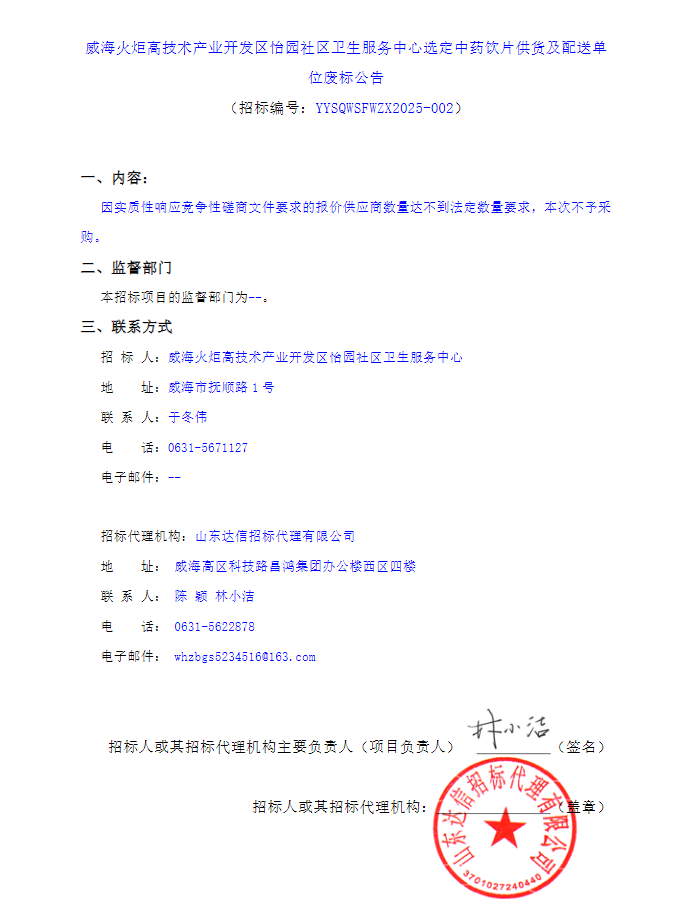 【威海火炬高技术产业开发区怡园社区卫生服务中心】山东省威海火炬高技术产业开发区怡园社区卫生服务中心选定中药饮片供货及配送单位废标公告