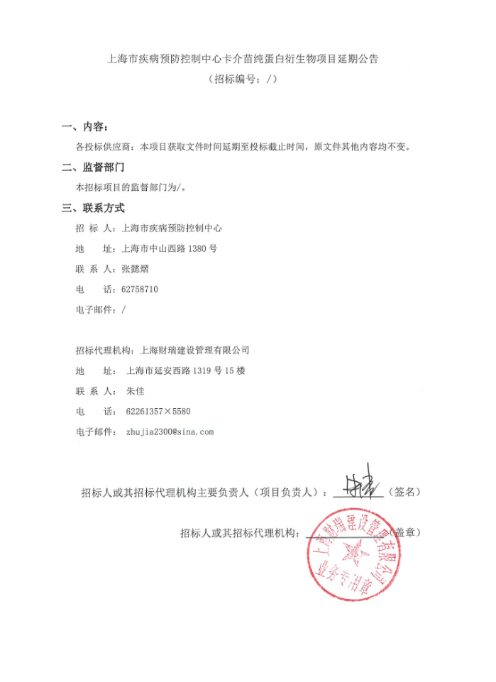 【上海市疾病预防控制中心】上海市疾病预防控制中心卡介苗纯蛋白衍生物项目延期公告