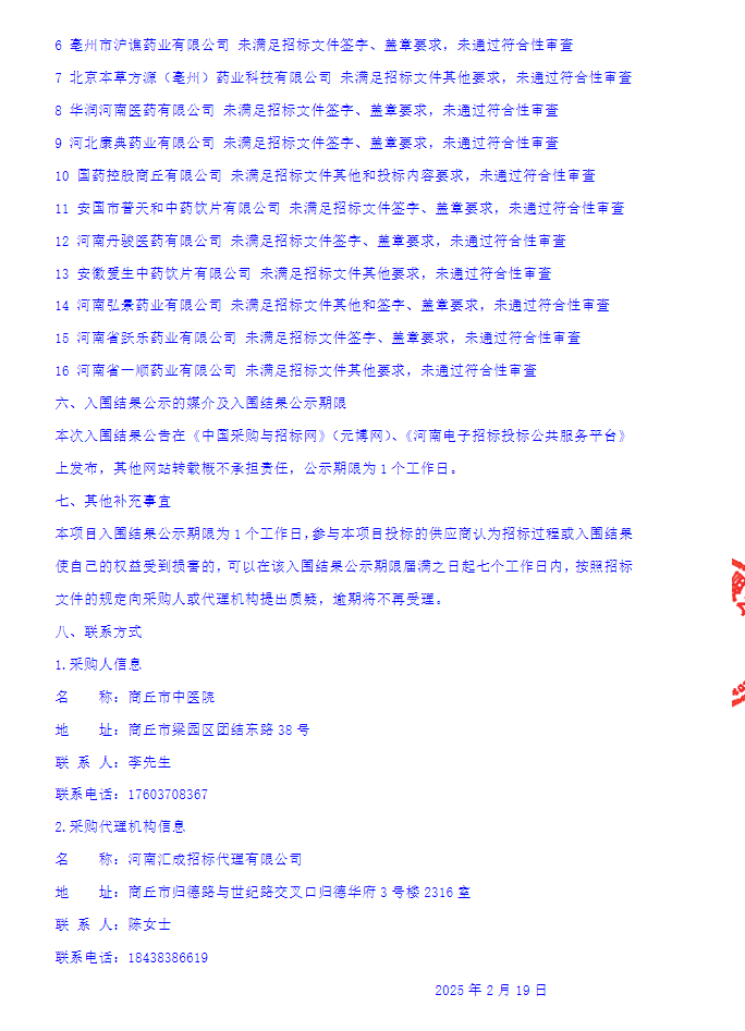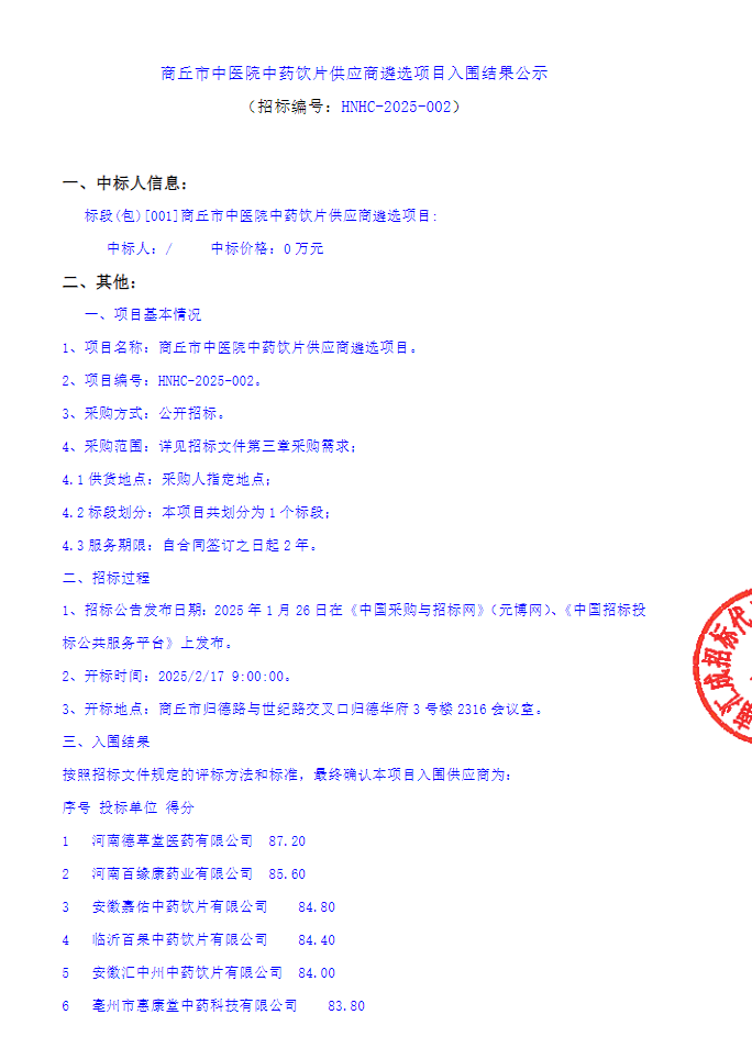 【商丘市中医院】河南省商丘市中医院中药饮片供应商遴选项目入围结果公示