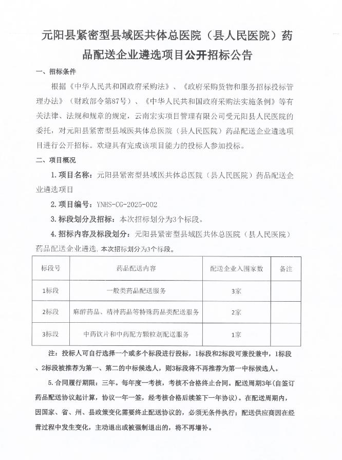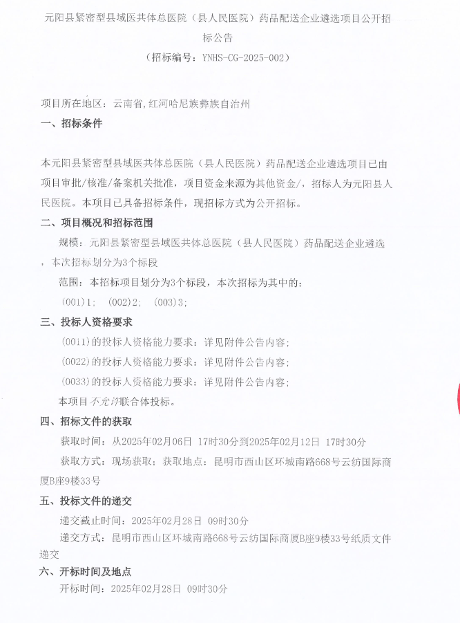 【红河哈尼族彝族自治州元阳县人民医院】云南省红河哈尼族彝族自治州元阳县紧密型县域医共体总医院(县人民医院)药品配送企业遴选项目公开招标公告