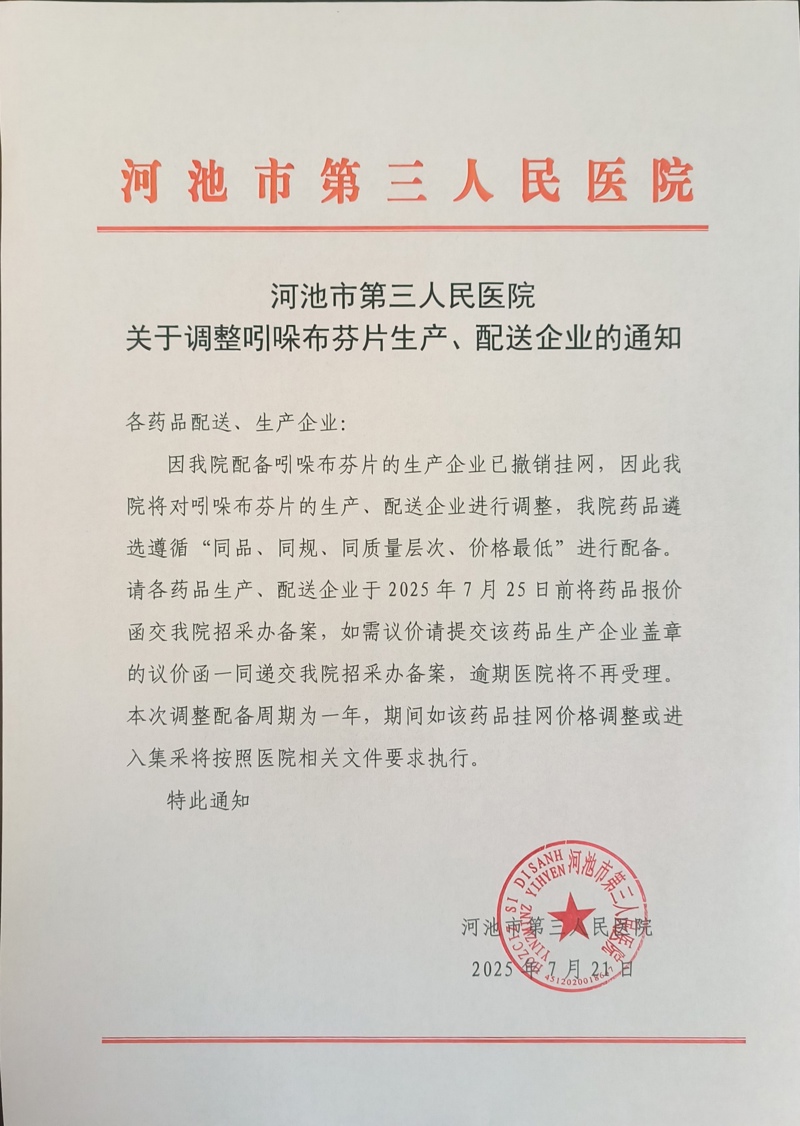【河池市第三人民医院】广西壮族自治区河池市第三人民医院关于调整吲哚布芬片生产、配送企业的通知