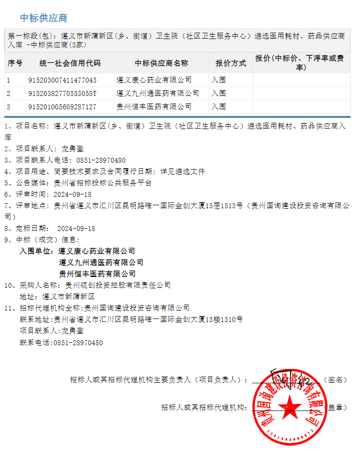 【贵州瓴创投资控股有限责任公司】贵州省遵义市新蒲新区(乡、街道)卫生院(社区卫生服务中心)遴选医用耗材、药品供应商入库成交公示