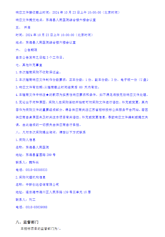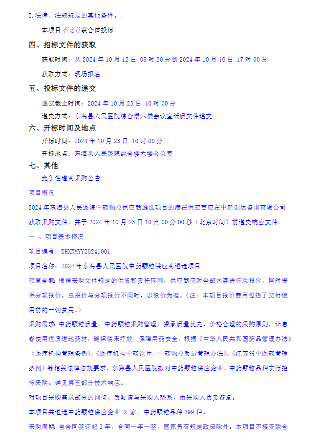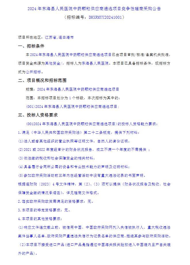 【连云港市东海县人民医院】江苏省连云港市2024年东海县人民医院中药颗粒供应商遴选项目竞争性磋商采购公告