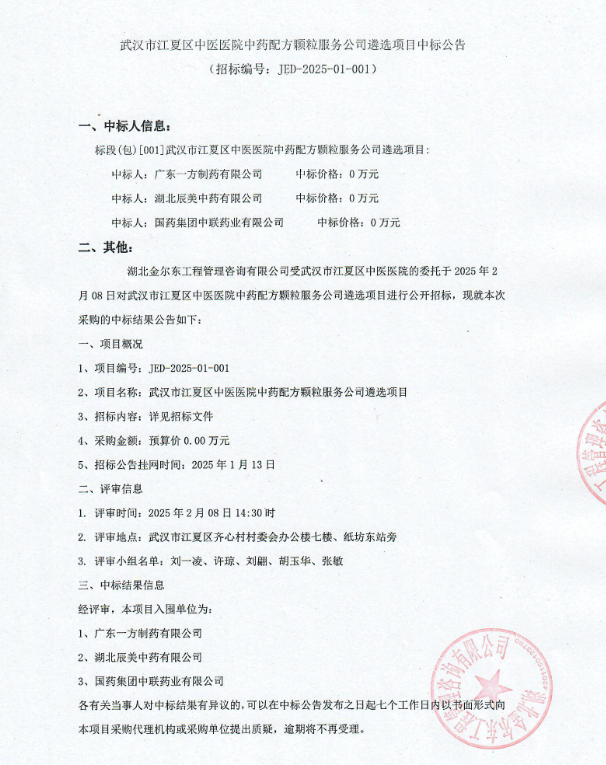 【武汉市江夏区中医医院】湖北省武汉市江夏区中医医院中药配方颗粒服务公司遴选项目中标公告