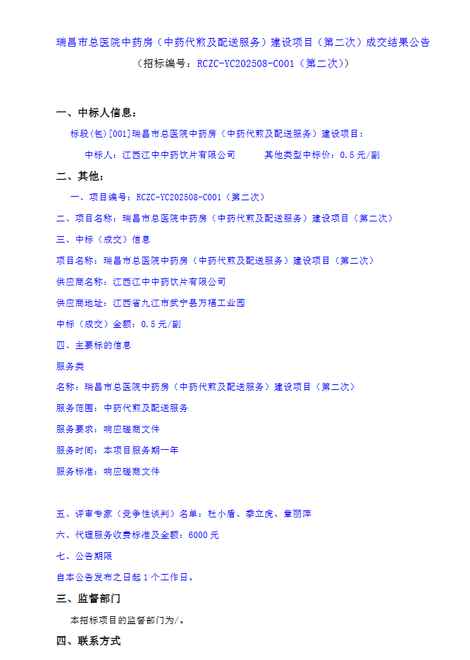 【九江市瑞昌市总医院】江西省瑞昌市总医院中药房(中药代煎及配送服务)建设项目(第二次)成交结果公告
