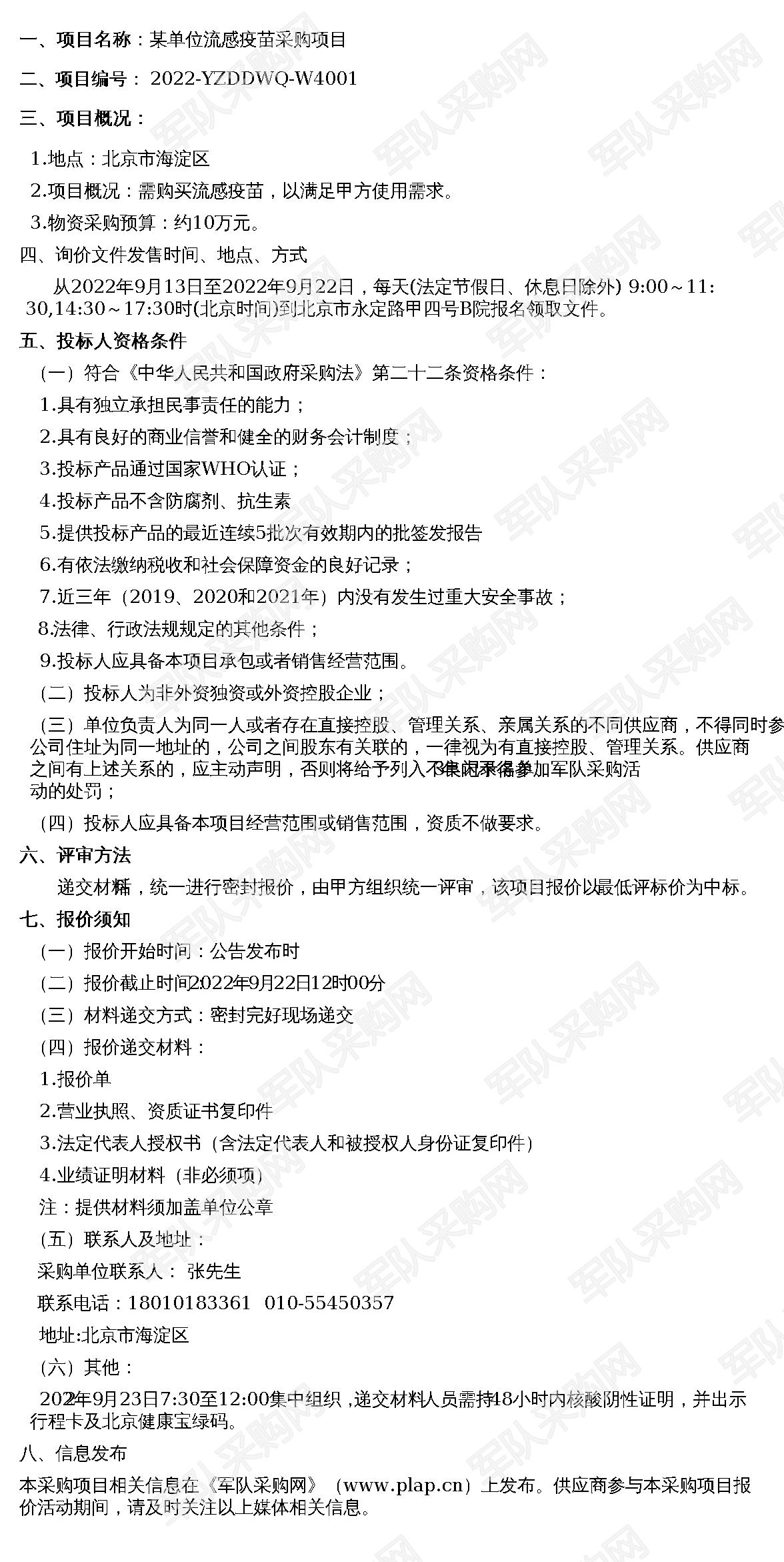 【军队采购网某单位】流感疫苗采购项目询价公告(2022-YZDDWQ-W4001)
