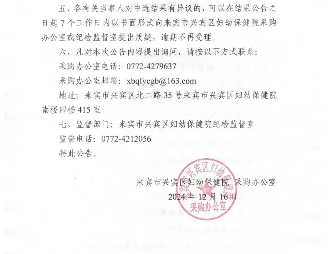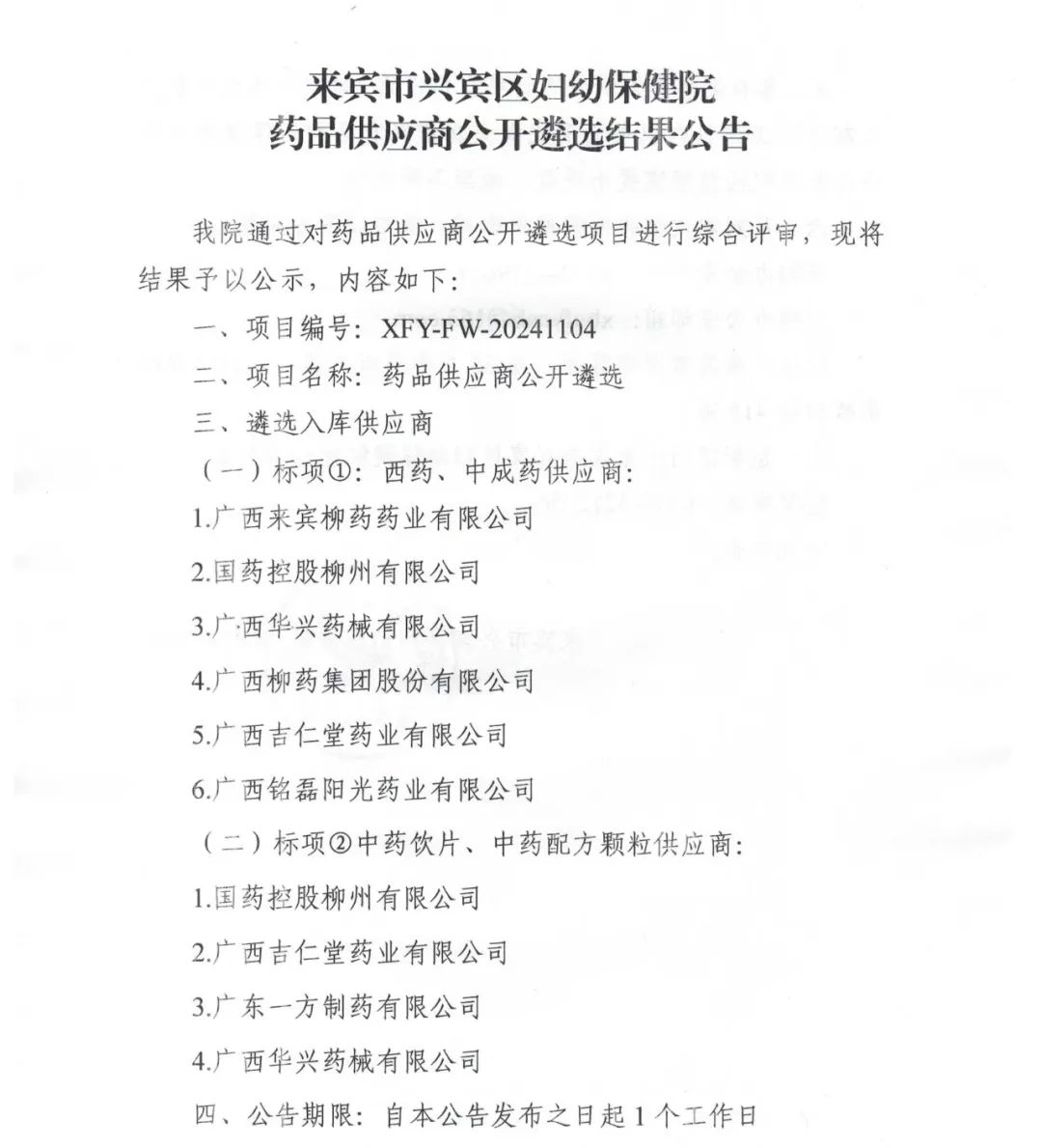 【来宾市兴宾区妇幼保健院】广西壮族自治区来宾市兴宾区妇幼保健院药品供应商公开遴选结果公告