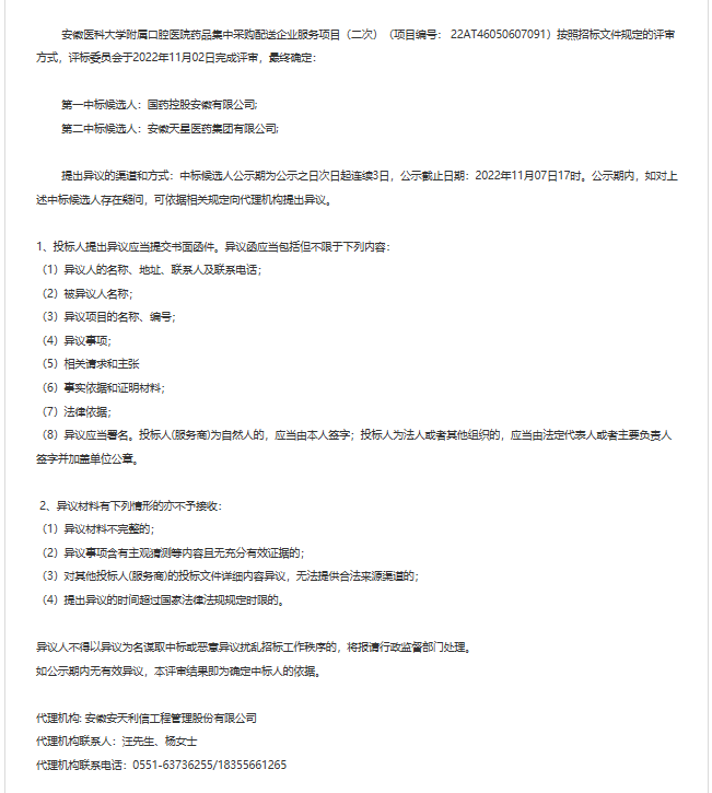 【安徽医科大学附属口腔医院】药品集中采购配送企业服务项目(二次)中标候选人公示