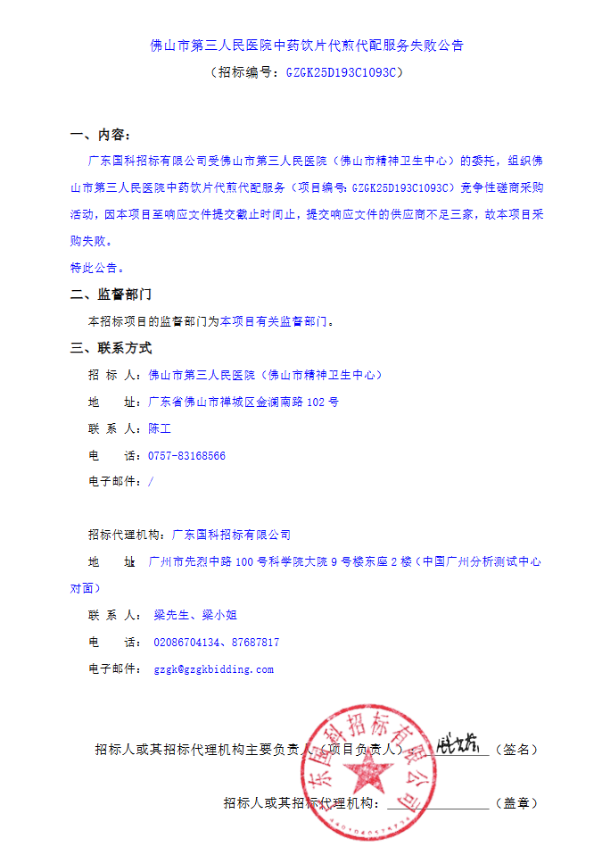 【佛山市第三人民医院】广东省佛山市第三人民医院中药饮片代煎代配服务失败公告