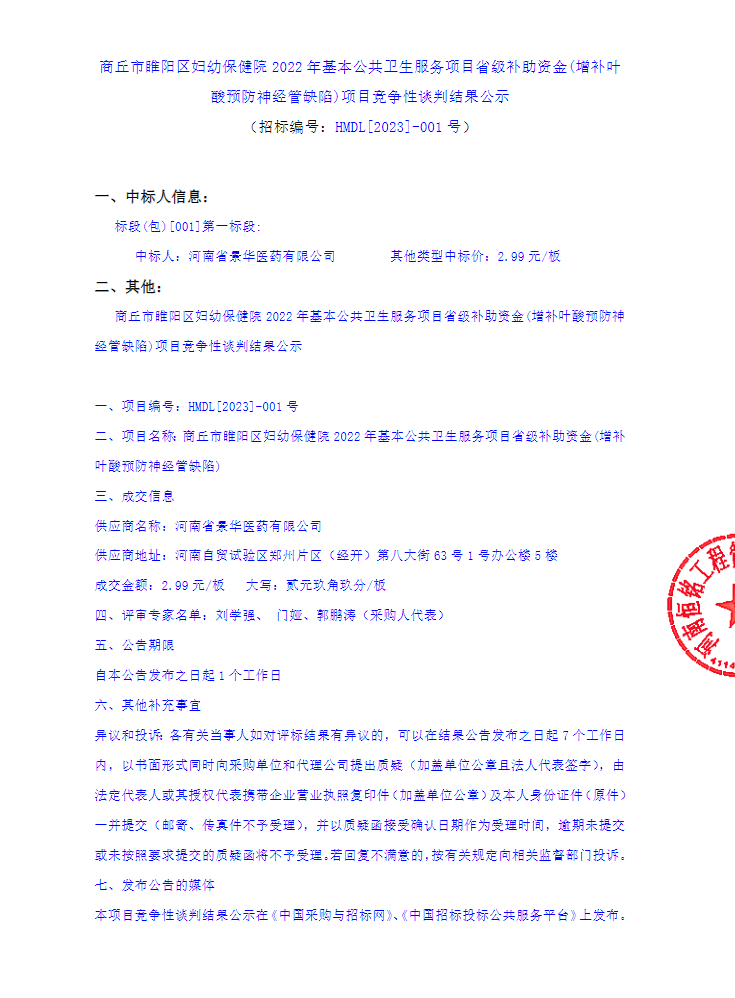 【商丘市睢阳区妇幼保健院】河南省商丘市睢阳区妇幼保健院2022年基本公共卫生服务项目省级补助资金(增补叶酸预防神经管缺陷)项目竞争性谈判结果公示