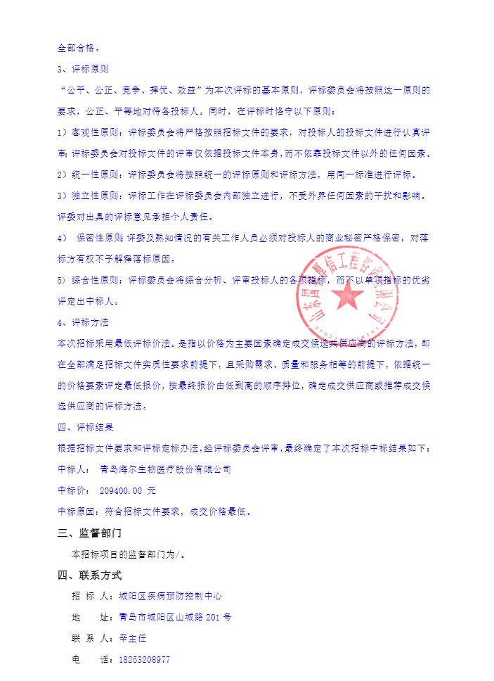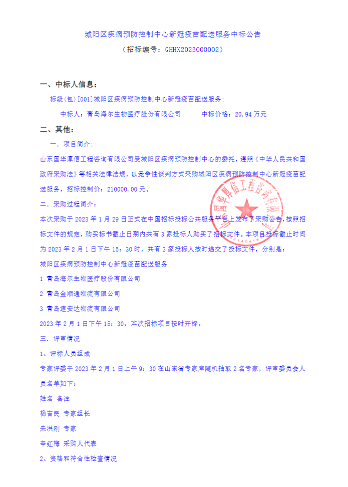 【青岛市城阳区疾病预防控制中心】山东省青岛市城阳区疾病预防控制中心新冠疫苗配送服务中标公告(20230201)
