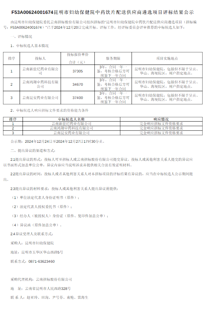 【昆明市妇幼保健院】云南省昆明市妇幼保健院中药饮片配送供应商遴选项目中标候选人公示