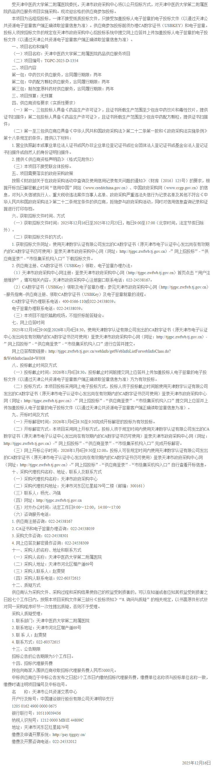 【天津中医药大学第二附属医院】天津中医药大学第二附属医院药品供应服务项目(项目编号TGPC-2025-D-1354)公开招标公告