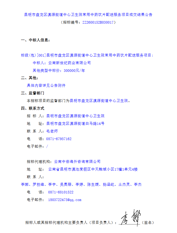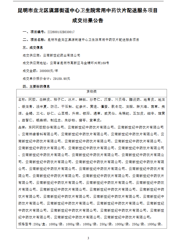 【昆明市盘龙区滇源街道中心卫生院】云南省昆明市盘龙区滇源街道中心卫生院常用中药饮片配送服务项目成交结果公告