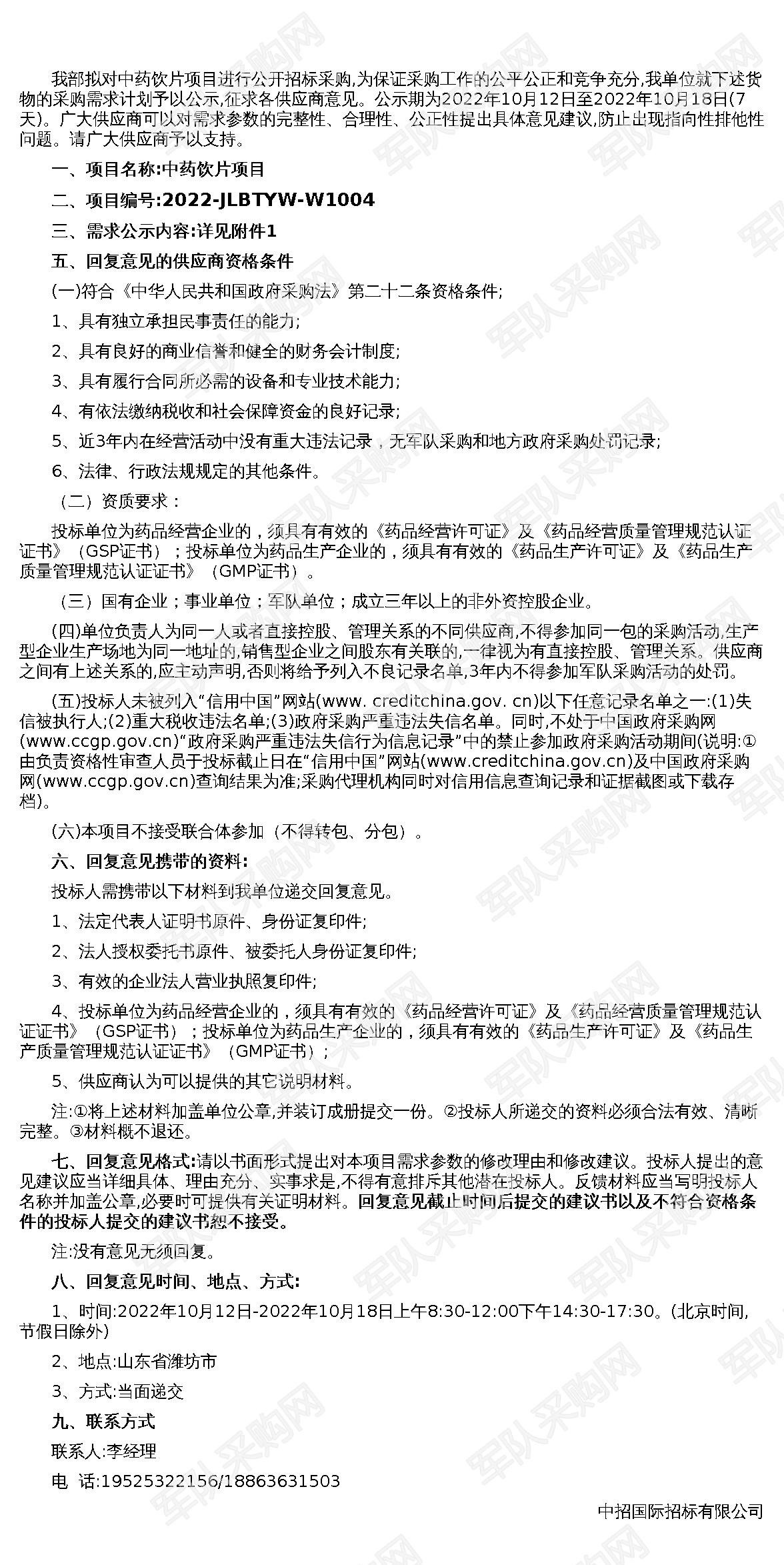 【军队采购网】中药饮片项目需求公示 (2022-JLBTYW-W1004)